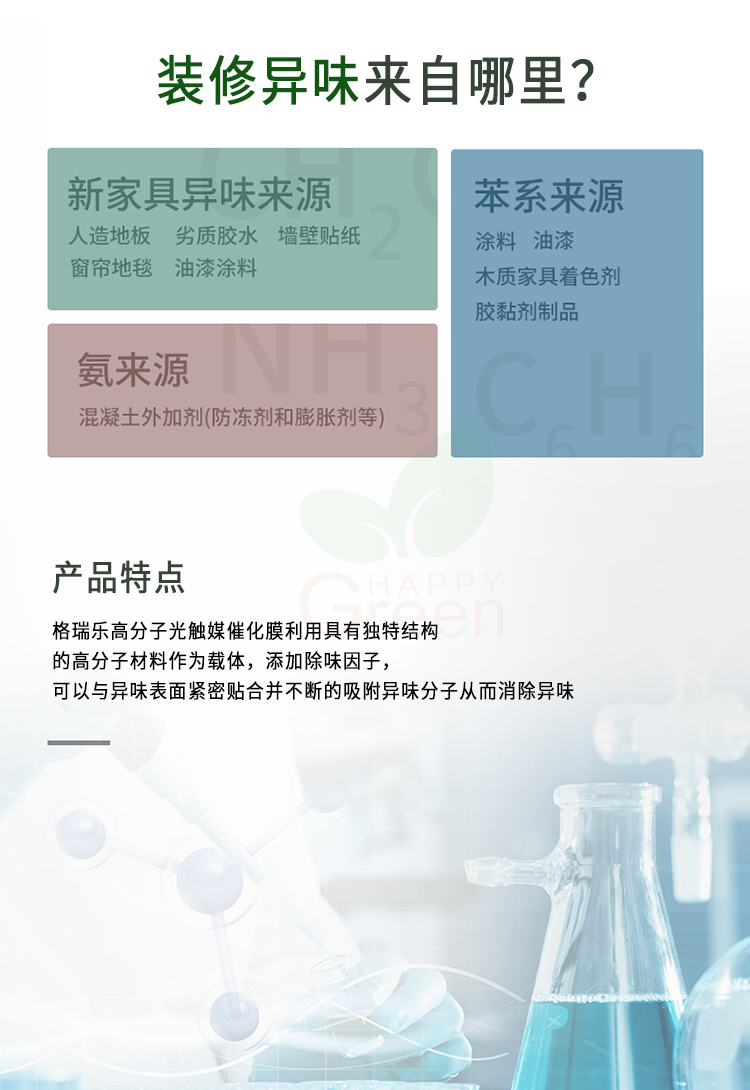 本品是格瑞乐环保公司推出的专门用于消除顽固异味的产品。本品利用具有独特结构的高分子材料作为载体,添加除味因子,可以与异味表面紧密贴合并不断的吸附异味分子从而消除异味。