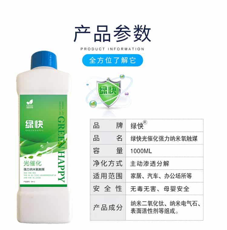绿快氧触媒2.0 【产品特点】 本产品由二氧化钛、纳米电气石粉和植物萃取精华液,经特殊工艺精制而成的一种纳米氧触媒,能产生强活性羟基自由基和氧负离子,能迅速、彻