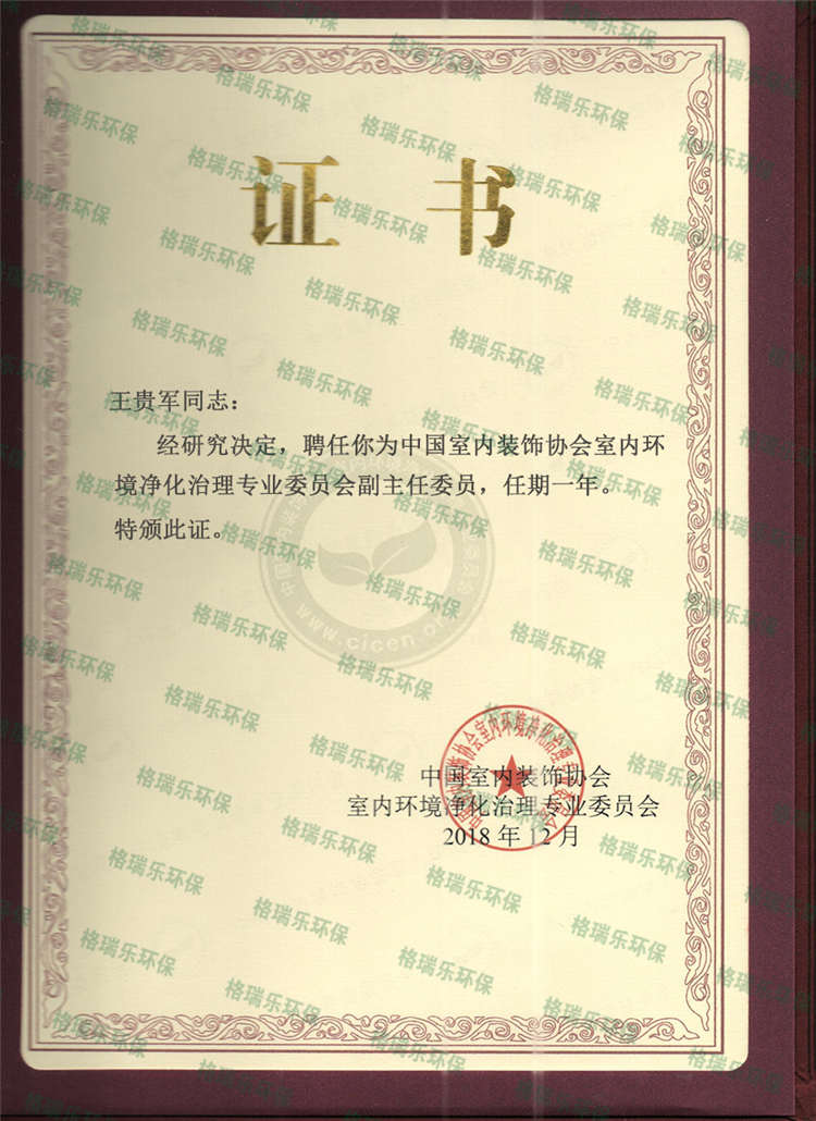 格瑞乐环保王贵军同志被聘为中国室内装饰协会室内环境净化治理专业委员会副主任委员