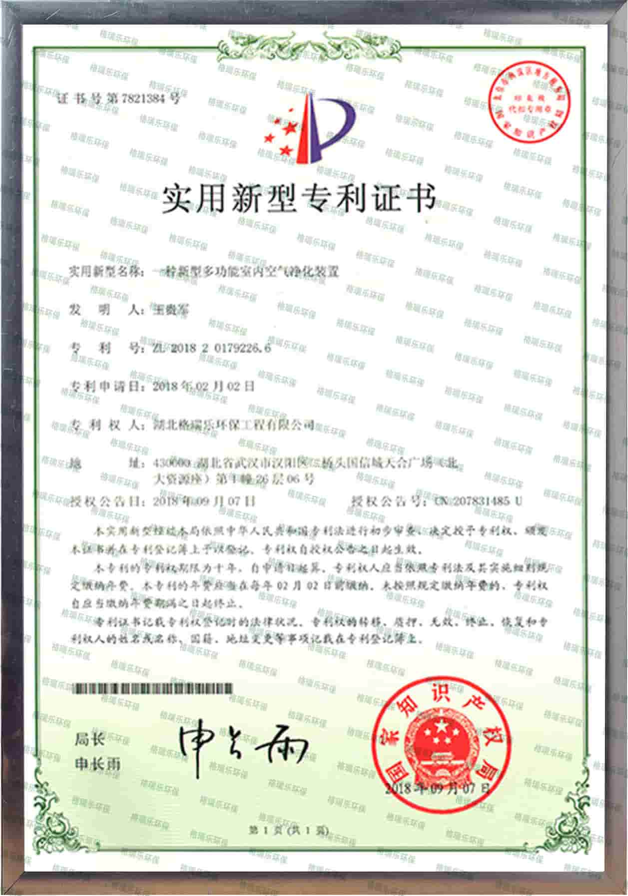 格瑞乐环保国家专利室内空气净化证书,专利证书号:ZL201820179226.6