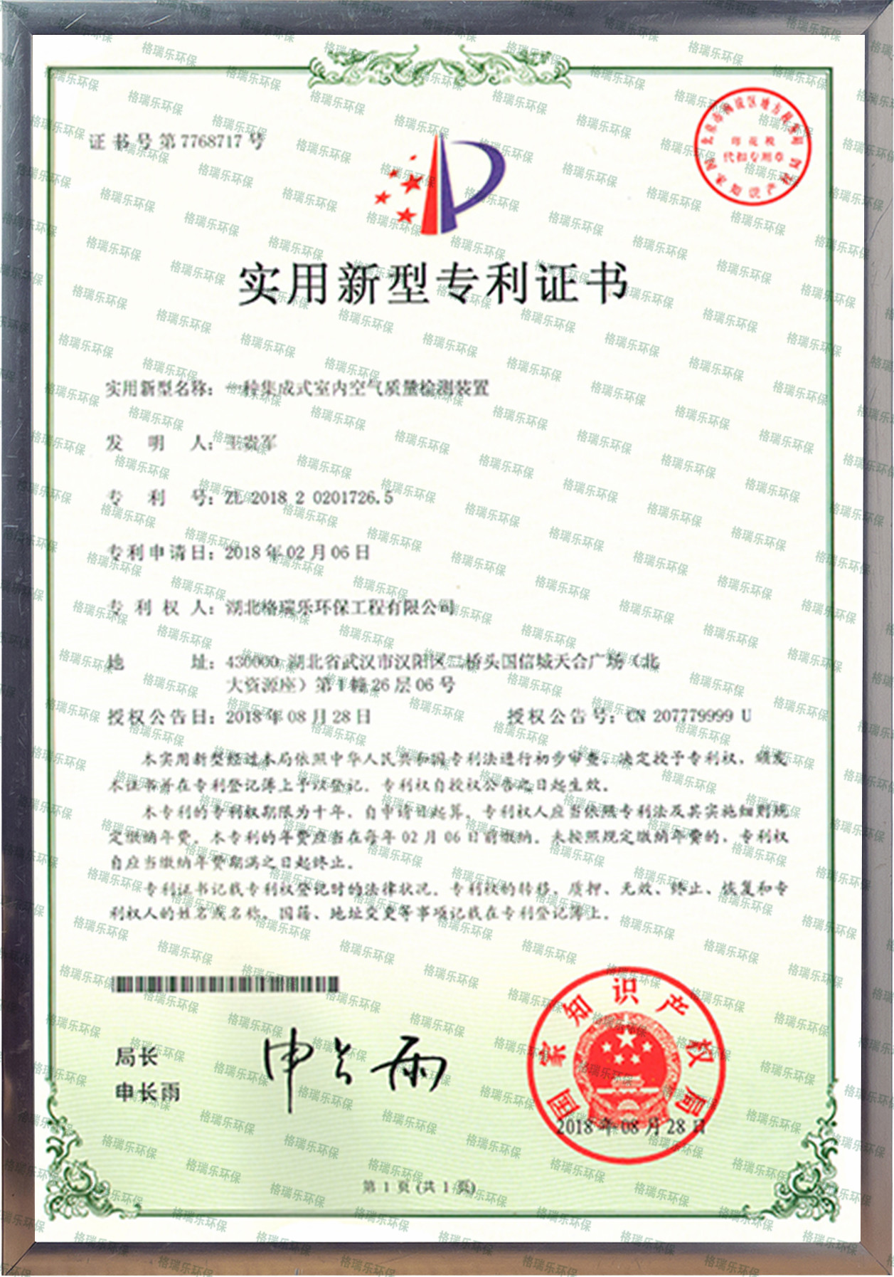 格瑞乐环保国家专利室内空气质量检测证书,专利证书号:ZL201820201726.5