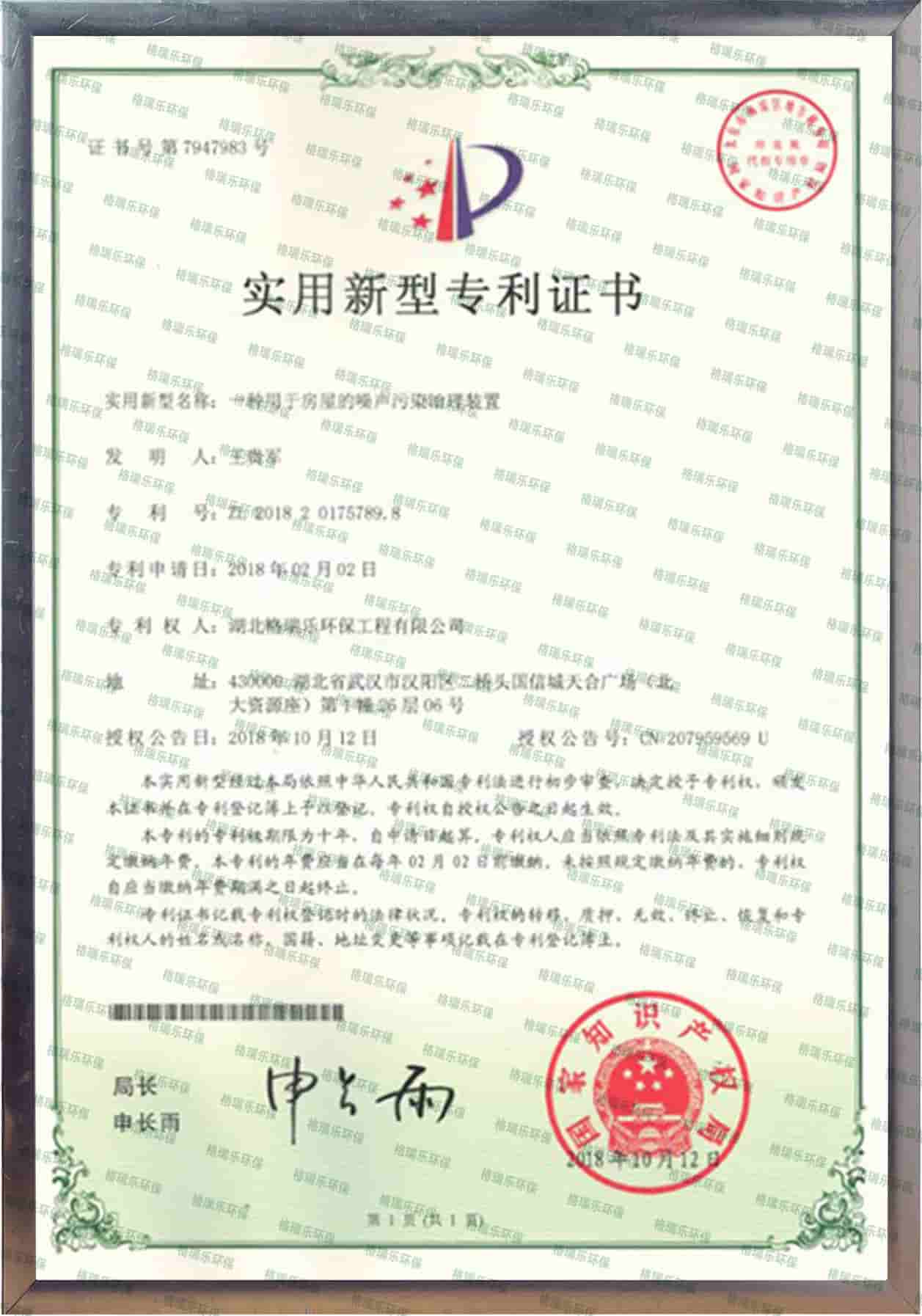 格瑞乐环保国家专利噪声污染治理,专利证书:ZL201820175789.8