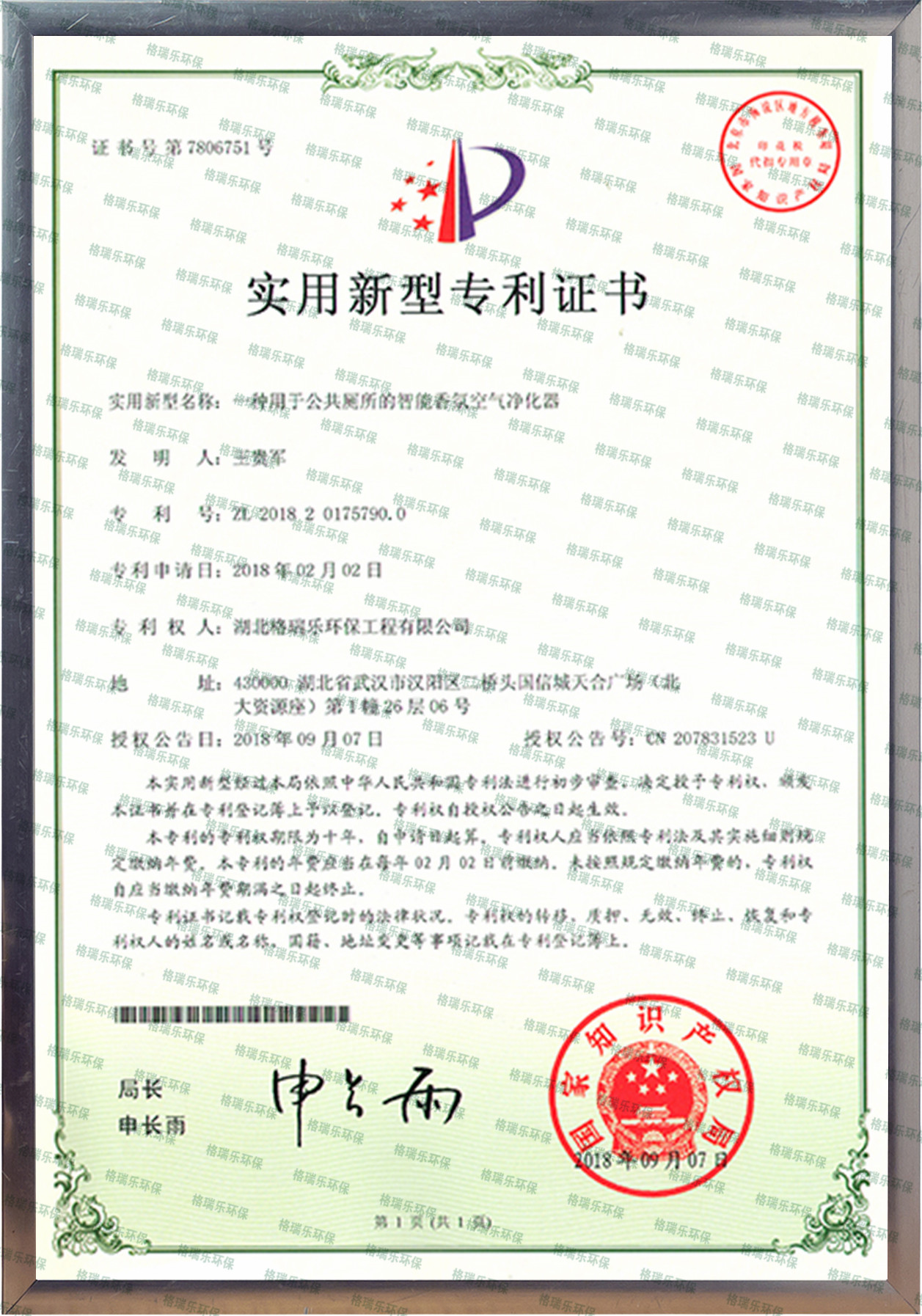 格瑞乐环保国家专利智能香氛空气净化,专利证书号:ZL201820175790.0
