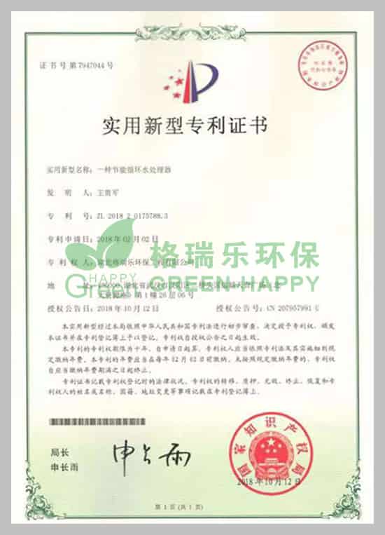 格瑞乐环保国家专利节能循环水处理证书,专利证书号:ZL201820175788.3