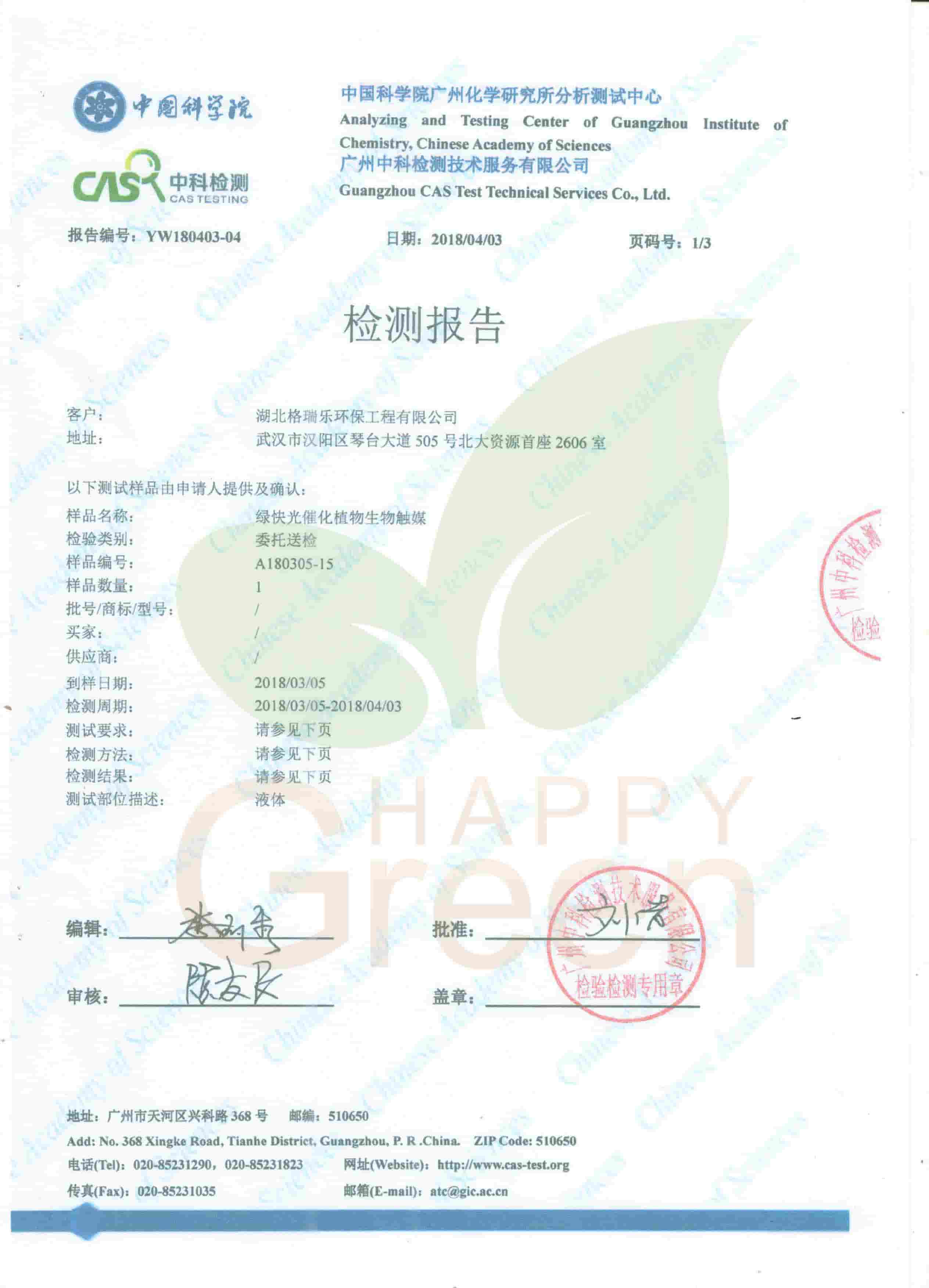 湖北格瑞乐环保工程有限公司绿快光催化植物生物触媒多次皮肤刺激性试验检测报告
